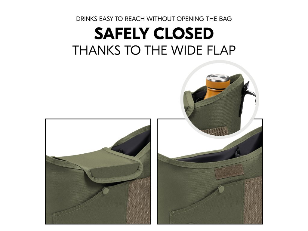 ĽAHKÝ PRÍSTUP S PRAKTICKÝM ZAPÍNANÍM // Mimoriadne široká, odolná klapka sa uzatvára a chráni vnútro organizéra, zatiaľ čo bočné otvory na fľaše zostávajú ľahko prístupné.