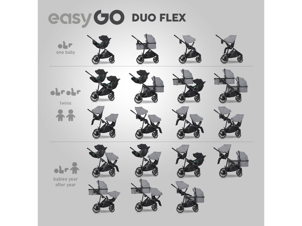 - Univerzálne využitie: Športová vanička EasyGo Duoflex je navrhnutá tak, aby slúžila pre jedno dieťa, dve deti za sebou, alebo ako kočík pre dvojčatá.