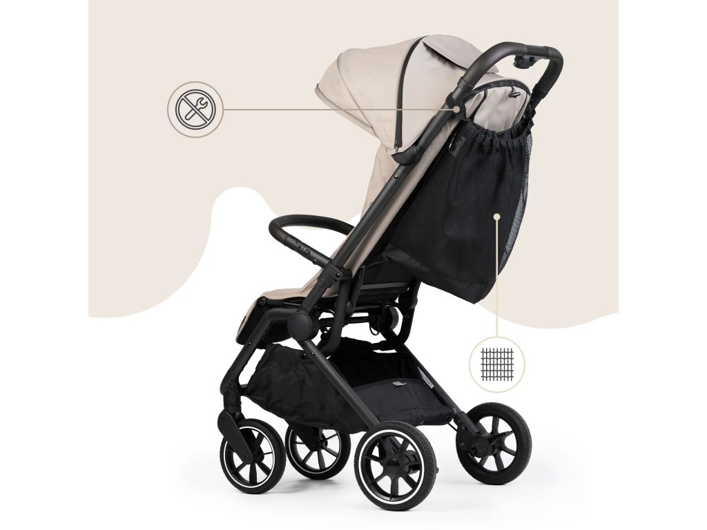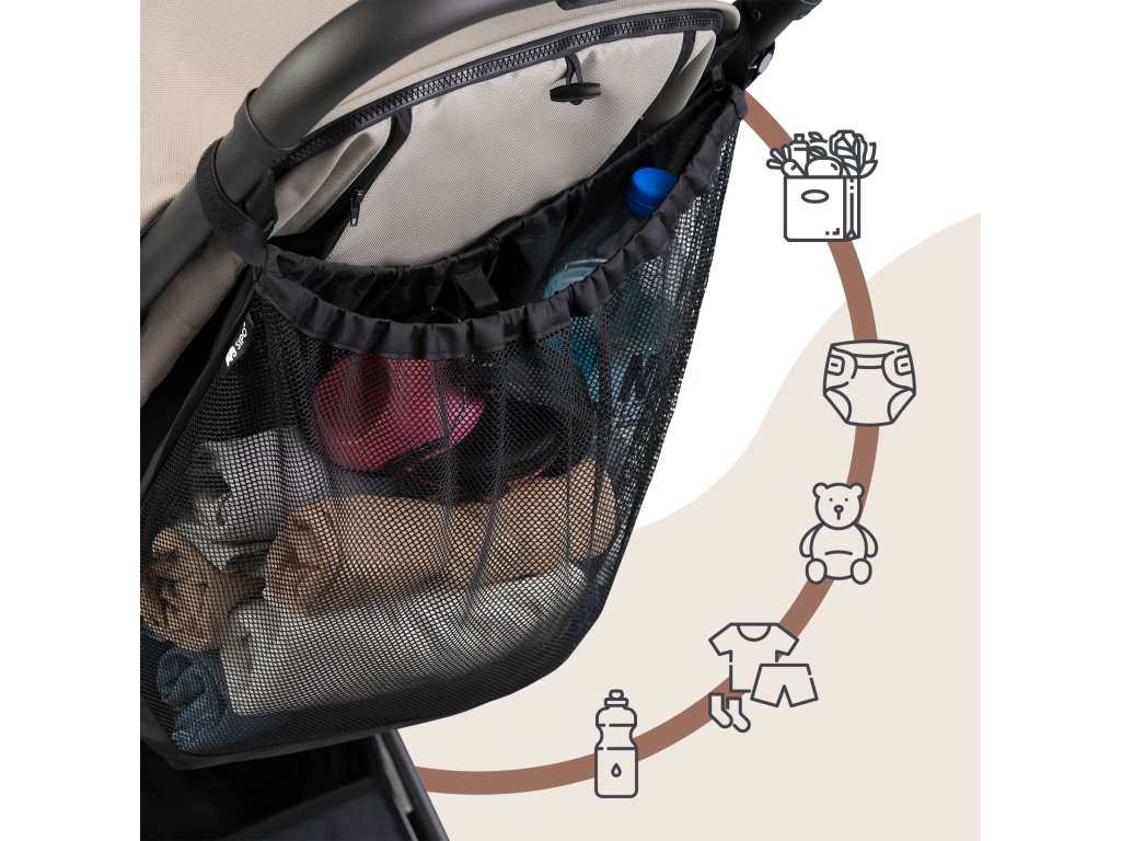 Sieťová taška je vybavená nastaviteľným systémom suchých zipsov pre rýchle a jednoduché pripevnenie k väčšine modelov kočíkov. Vysoko kvalitný materiál zaisťuje odolnosť proti každodennému používaniu, zatiaľ čo sieťovina umožňuje rýchly prehľad o obsahu. Horné zapínanie chráni predmety pred vypadnutím počas jazdy.