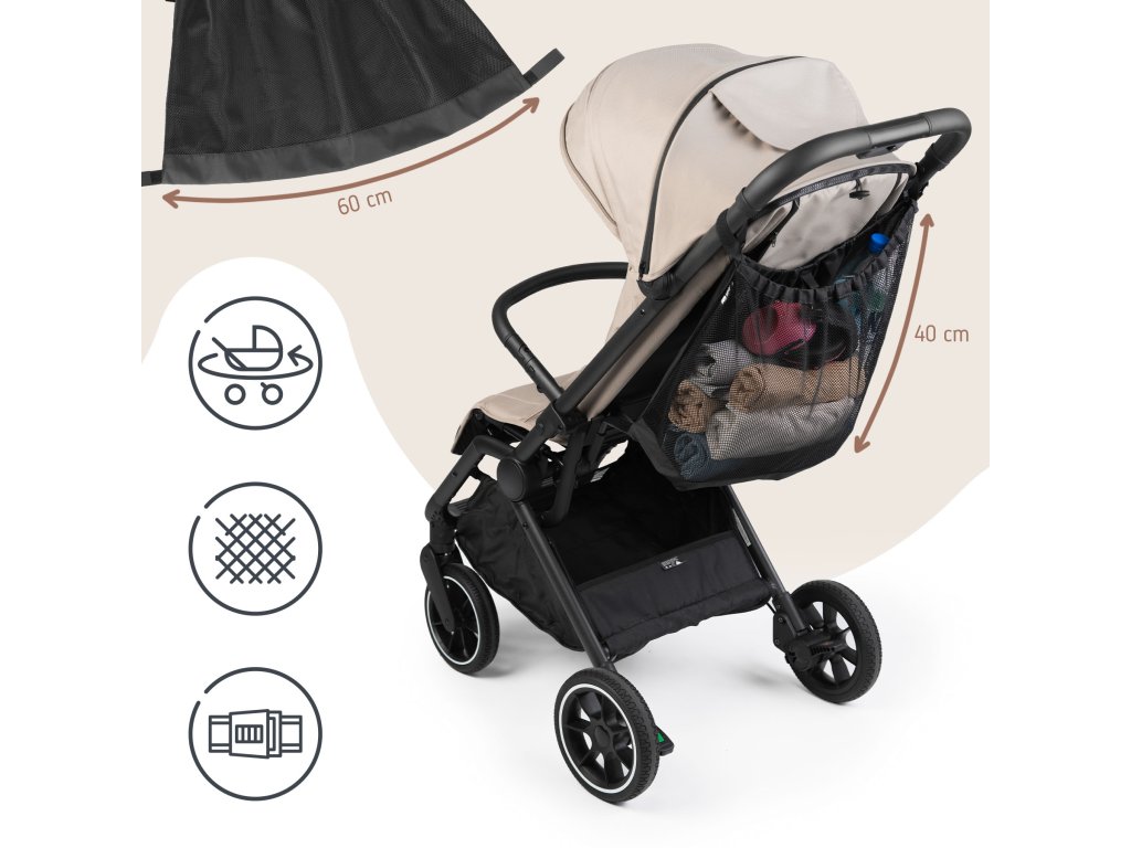 Tento priestranný a odolný sieťový organizér je určený na použitie s detskými kočíkmi. Vďaka svojmu chytrému dizajnu kombinuje pružnú sieťovinu a textilnú tkaninu, ktoré poskytujú bezpečné a pohodlné miesto na uloženie malých predmetov, ako sú fľaše, snacky, hygienické potreby, hračky alebo nákup.