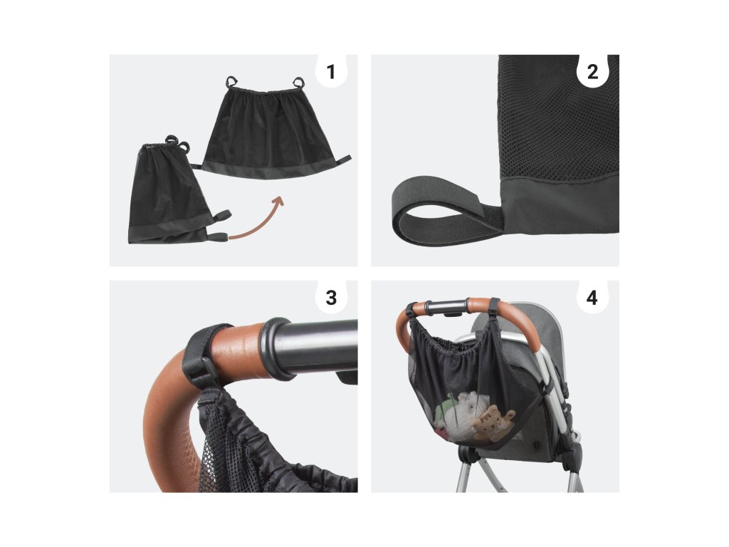 Pred použitím rozložte organizér (sieťovú tašku) a pripevnite ho k rámu kočíka alebo rukoväti tak, že popruhy omotáte okolo vybraných častí. Dĺžku popruhov upravte pomocou suchých zipsov, aby organizér pevne držal. Vložte do neho svoje veci, zatvorte hornú klopu a zaistite ju suchým zipsom. Ak chcete organizér odstrániť, jednoducho odopnite suché zipsy. V zloženom stave sa produkt dá ľahko skladovať alebo prepravovať.