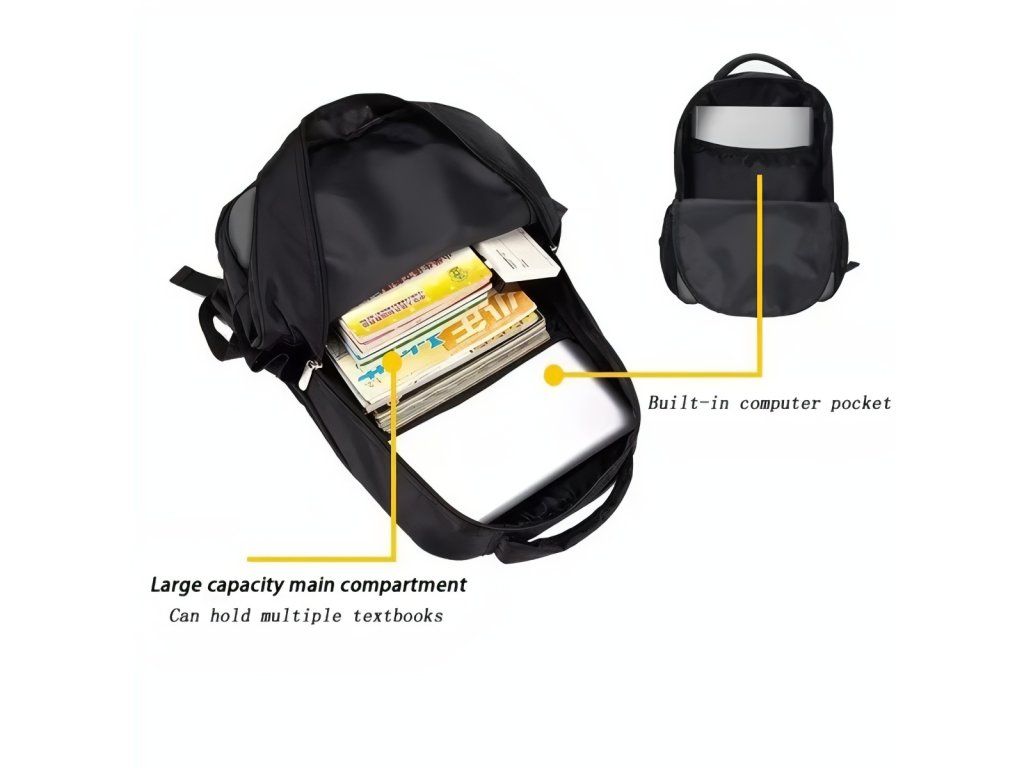 Batoh má jedno hlavné zapínanie na zips na hornej časti. Zips je klasický nylónový s kovovým jazdcom a je vedený cez vrchný oblúk batohu. Na hornej strane je tiež pevné pútko na nosenie v ruke. Po stranách sú dve sieťované kapsy, vhodné na fľašu s pitím, dáždnik alebo drobnosti. Batoh má dva ramenné popruhy, ktoré sú nastaviteľné pomocou plastových preč, takže je možné upraviť dĺžku podľa potreby. Popruhy sú prišité zesíleným trojuholníkovým švom, čo zvyšuje odolnosť pri nosení. Predná časť batohu tvorí veľká plocha s potlačou postáv. Hlavný úložný priestor je jedna väčšia časť a jedna malá vnútorná kapsa.