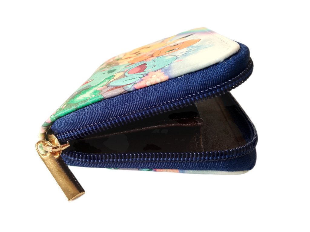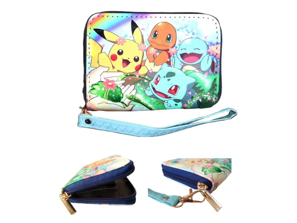 Na prednej strane sú vyobrazení obľúbení Pokémoni – Pikachu, Charmander, Bulbasaur a Squirtle – v roztomilom a veselom prevedení plnom farieb, kvetín a dúhy. Dizajn peňaženky je hravý a zábavný, ideálny pre deti, ktoré si chcú nosiť vreckové štýlovo.