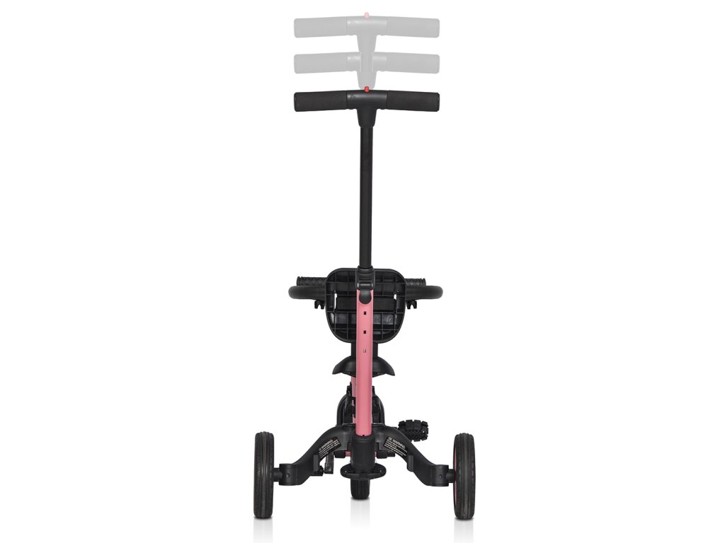Kočík (1-2 roky): Nahrádza kočík s opierkou a bezpečnostnými pásmi. Predné pedále slúžia ako podnožka, zatiaľ čo rodič pohodlne ovláda výškovo nastaviteľnú tyč.