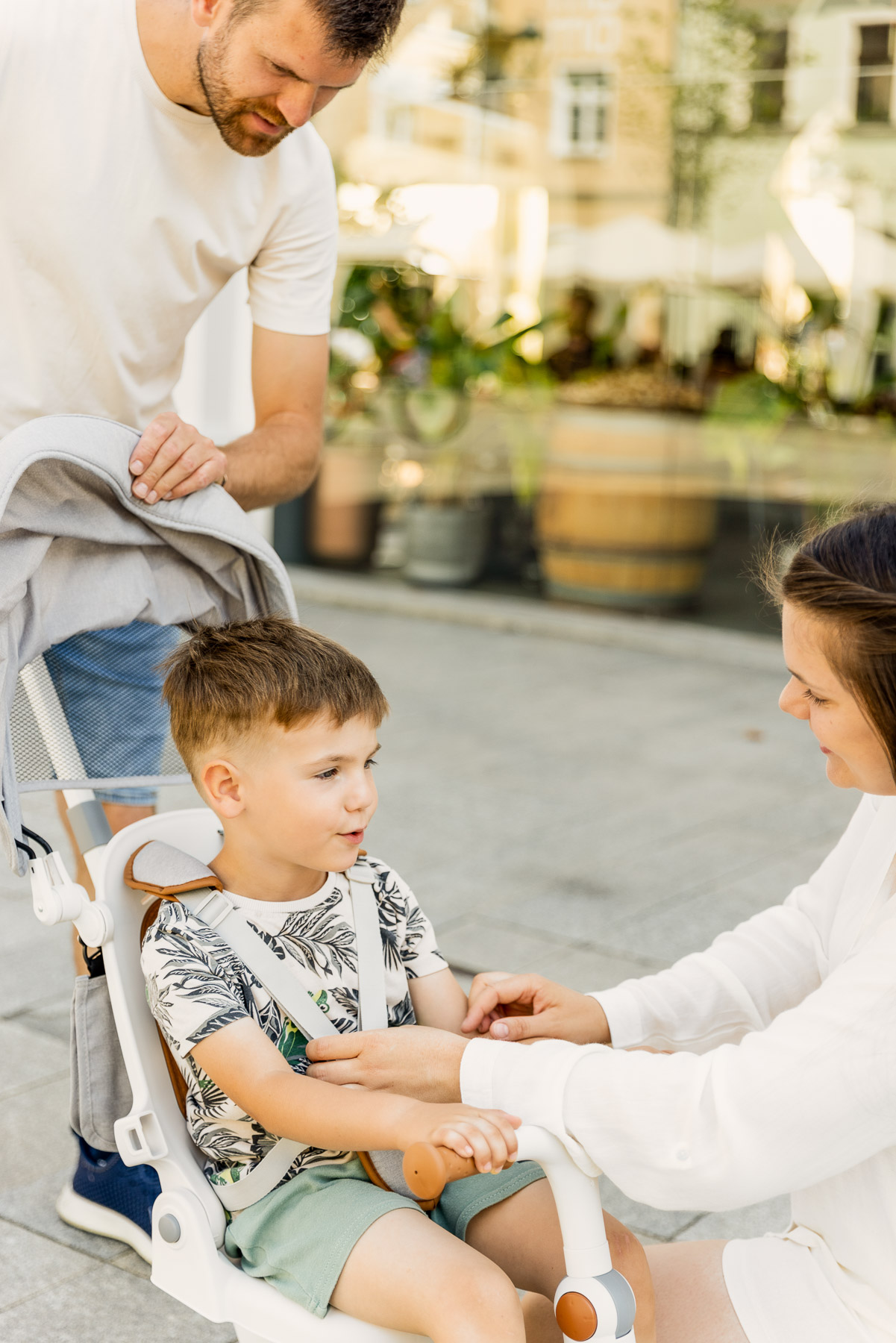 - 5-bodové nastaviteľné bezpečnostné pásy pre bezpečnosť dieťaťa.