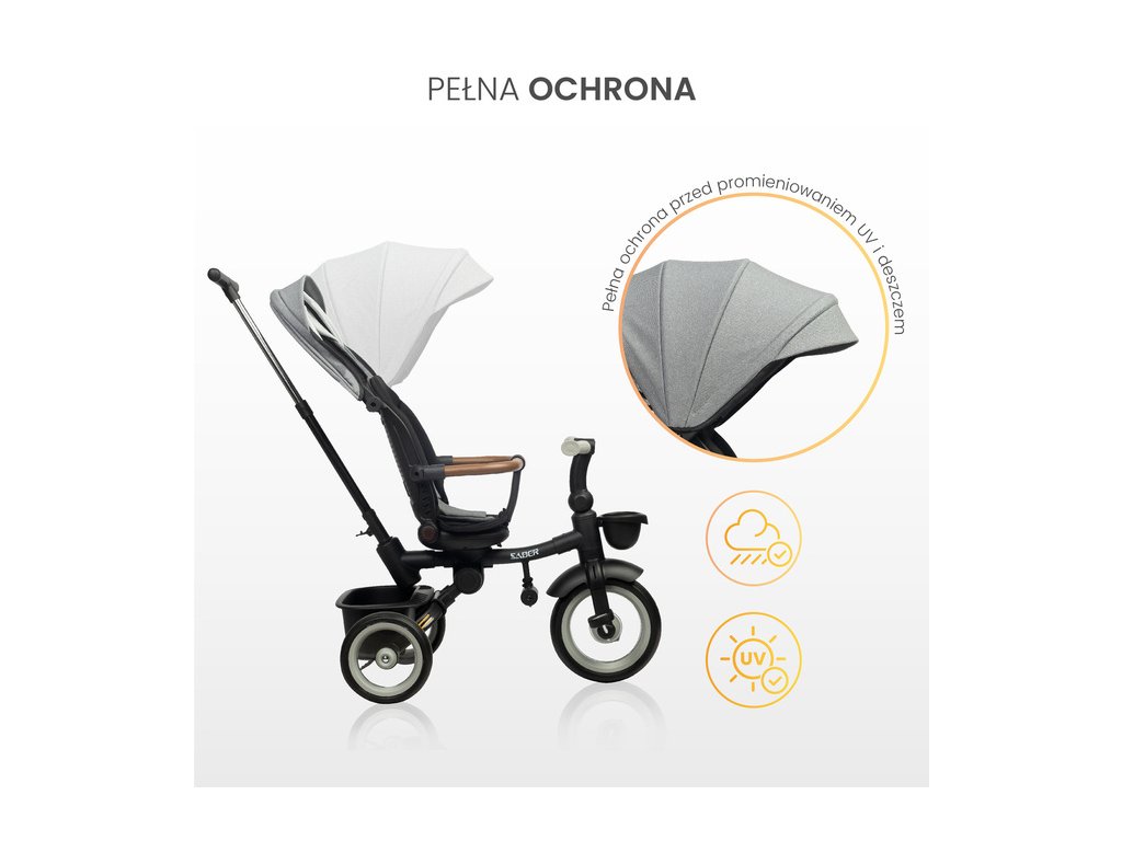 Skladacia strieška účinne chráni pred dažďom a intenzívnym UV žiarením.