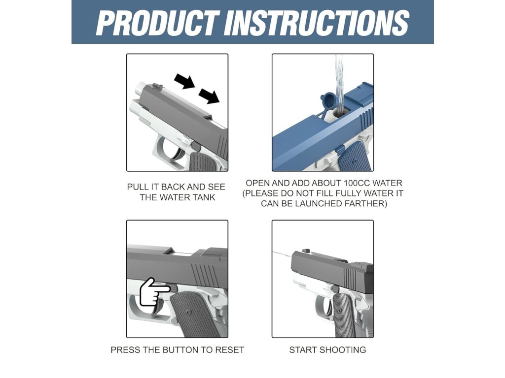 Táto vodná pištoľ je vyrobená z kvalitného plastu a jej dizajn pripomína klasickú pištoľ, čo hre dodáva dramatickosť a napätie. Stačí posunúť hornú časť dozadu, odklopiť viečko a naplniť zásobník približne 100 ml vody. Pre optimálny výkon sa odporúča nádrž nenaplniť až po okraj.